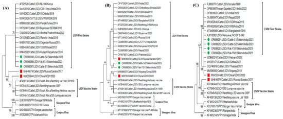 Phylogenetic analysis of full-length genes (A) P32, (B) RPO30, and (C) GPCR sequences of LSDV from Cattle and Yak. The phylogenetic tree is constructed based on the virus isolated from cattle and yak during the Sikkim LSD outbreak, in comparison to reference strains from GenBank. The tree was constructed using the maximum likelihood method with 1000 bootstrap values in Molecular Evolutionary Genetics Analysis (MEGA) Version.11 software (http://www.megasoftware.net). Both isolates from Cattle and Yak species are clustered with LSDV field strains circulating in India. The round (Green) symbols indicate the newly obtained isolates in this study, while the square (Red) symbols indicate the recombinant strains of LSDV.