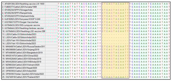 Multiple sequence alignment of GPCR sequences of Cattle and Yak LSDV isolates along with other Capripoxviruses circulating worldwide, showing the 12-nucleotide deletion (94–105) (highlighted region).