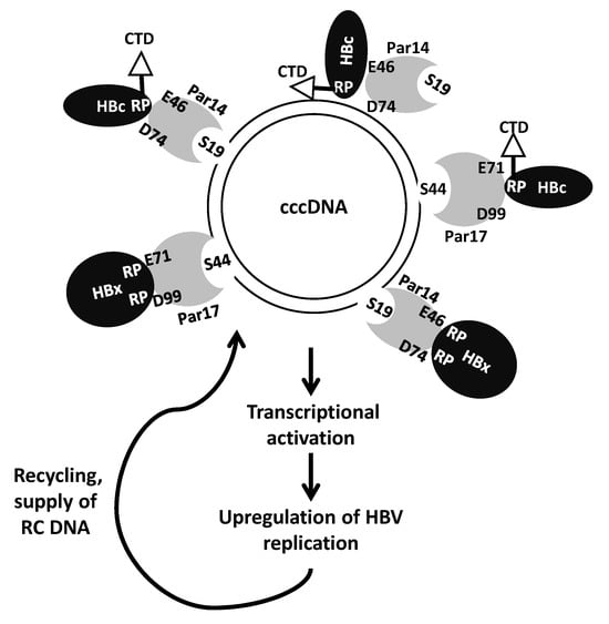 The HBV cccDNA minichromosome associates with histone and non-histone cellular and viral proteins, including HBc and HBx. In the nucleus, HBc binds to cccDNA and host proteins, such as Par14 and Par17, which can directly bind to cccDNA, interact with HBc, and promote the recruitment of HBc into cccDNA, consequently upregulating HBV replication by several folds.