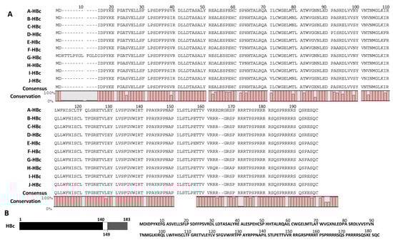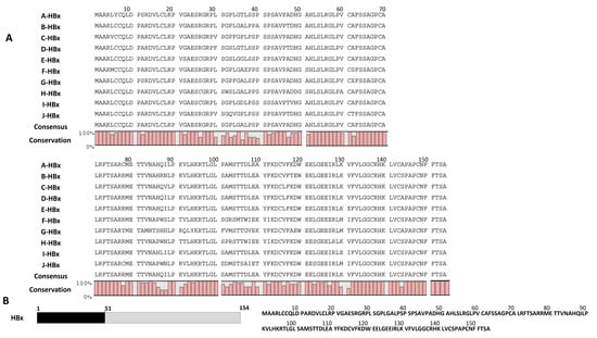 A total of 237 HBx and 207 HBc sequences belonging to all major 10 genotypes of HBV were randomly retrieved from the National Center for Biotechnology Information database (https://www.ncbi.nlm.nih.gov/nuccore/ (accessed on 2 February 2023)). These sequences were reported from all over the world including the USA, Canada, Brazil, Venezuela, Argentina, France, Germany, The Netherlands, Mexico, Belgium, China, South Korea, Japan, Indonesia, Thailand, Viet Nam, Turkey, Pakistan, India, South Africa, Ghana, Côte d’Ivoire, Nicaragua, Mauritius, and Martinique. The HBx and HBc amino acid sequences were fed into CLC Main Workbench v. 8 (Qiagen GmbH, Hilden, Germany). Using the multiple sequence analysis feature of the software, we constructed consensus sequences of each genotype (A–J). The consensus sequences of all ten genotypes thus constructed were subsequently aligned to obtain global consensus sequences of HBx and HBc.