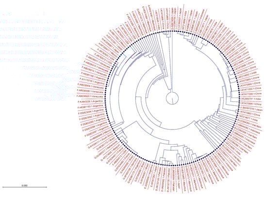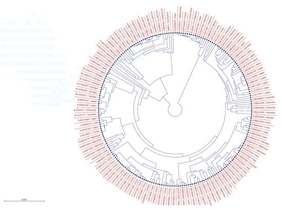 Similarly, we aligned HBc consensus sequences from all ten HBV genotypes, constructed a global consensus sequence, shown at the base (Figure 4A), and analyzed various domains and motifs for conservancy or variability of amino acids. The graphs depict the percentage conservancy of HBc amino acids. Highly conserved residues are shown by their symbols, while variable regions are labeled by “X”. Short peptides were selected (Table 2) from highly conserved regions of the HBc global consensus sequence (Figure 4A,B), which might offer potent target sites for the development of a peptide vaccine or designing site-specific anti-HBV inhibitors. The phylogenetic tree of 207 HBc sequences from 10 genotypes worldwide was constructed (Figure 5), indicating evolutionary relatedness between the sequences.