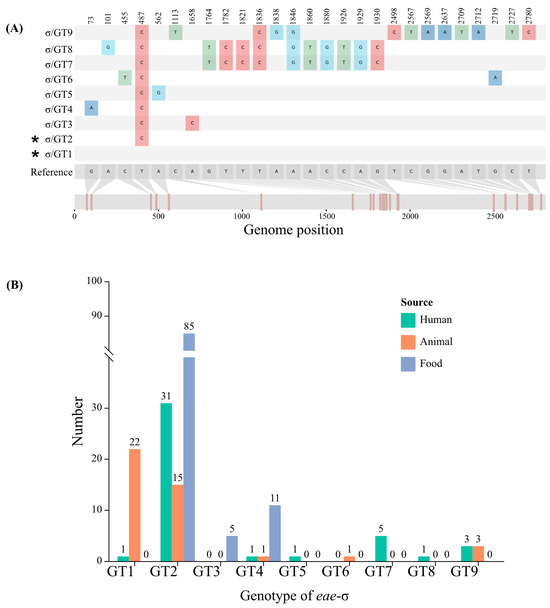 (A) The nucleotide differences among eae-σ GTs. The asterisk represented the synonymous mutation. (B) The distribution of eae-σ GTs among strains isolated from different sources.