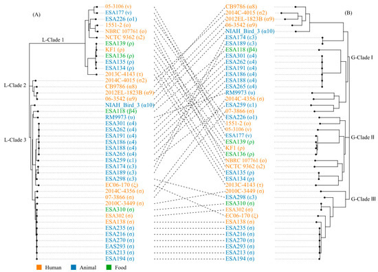 To explore concordance between LEE phylogenetic and pan-genome tree, a pan-genome tree was constructed using the 40 complete genomes of E. alberti, which was compared to that of LEE. The pan-genome tree also formed three major clades, namely G-Clade I, II, and III. Each clade contained strains derived from humans, animals, and food. The result indicated a significant divergence relationship for LEE, which was reflected in the tanglegrams (Figure 2). Only L-Clade 1 of the LEE phylogenetic tree was correlated with G-Clade II of the pangenome tree. L-Clade 2 of the LEE phylogenetic tree was correlated with a portion of G-Clade I of the pangenome tree. L-Clade 3 of the LEE phylogenetic tree was correlated with both G-Clades I and III of the pangenome tree.