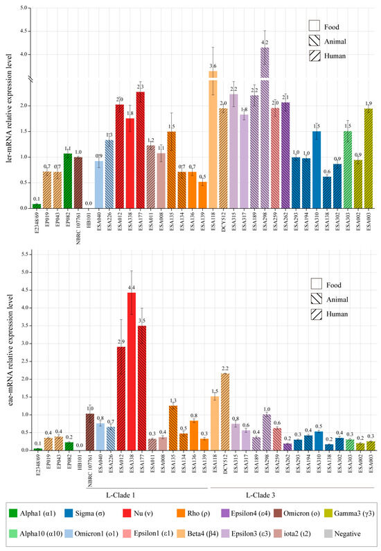 The ler gene, encoded in the LEE1 operon, is the master transcriptional factor of the six LEE operons [3]. The eae gene, which encodes intimin in the LEE5 operon, contributes to the establishment of the attaching and effacing (A/E) lesion [1]. The expression levels of ler and eae genes were evaluated using qRT-PCR assays. Compared to strain NBRC 107761, all E. albertii isolates presented ler and eae transcript levels varying from 0.5 to 4.2-fold and 0.2 to 4.4-fold, respectively. Strain ESA298 isolated from animal source with eae-ε3 subtypes displayed the highest transcript level of ler gene, while its transcript level of eae gene was relatively low. A significantly higher expression level of the eae gene was observed in eae-ν strains (eg., ESA012, ESA138, and ESA177), with the transcript level ranging from 2.9 to 4.4-fold. However, no significant differences in ler transcript levels among strains with different eae subtypes or sources were found (Figure 3).
