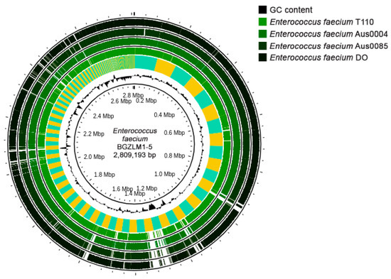 Circular genome map of Enterococcus faecium BGZLM1-5 visualized and compared with those of selected pathogenic and probiotic Enterococcus faecium strains using Proksee. Circles from the inside to the outside: the first ring represents the scale marks in megabase pairs (Mbp) and GC content (black); the second ring represents a comparative analysis of the BGZLM1-5 genome against the strain T110 genome using BLAST+ 2.12.0 software, followed by rings representing the strain Aus0004, Aus0085, and DO compare genomes.