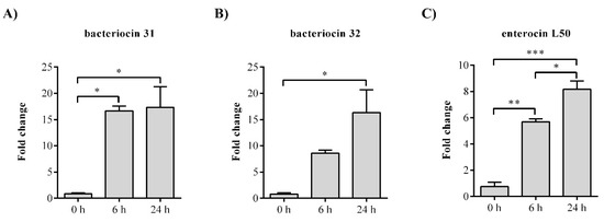 To show which of the bacteriocin genes is responsible for the antimicrobial activity of BGZLM1-5, gene expression analysis was performed for the following genes: entlA, bac31, bac32, and entL50. The analysis of the bacteriocin 31 transcription revealed a 16.6-fold increase at the 6th and 17.4-fold increase at the 24th h for the bac31 gene, while the bacteriocin 32 transcription revealed a 16.4-fold increase at the 24th h for the bac32 gene. The mRNA relative levels of enterocin L50 were significantly increased at the 6th and 24th h (5.7-fold and 8.2-fold, respectively). No changes were observed in enterolysin A (Figure 2).