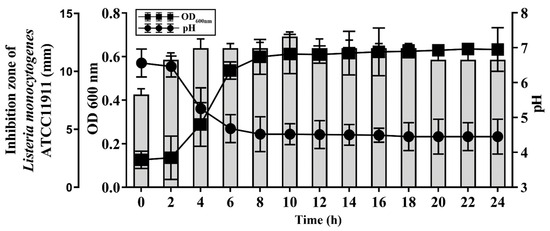 The kinetics of the antimicrobial activity were followed by the inoculation of 1000 mL of GM17 broth with 1% (v/v) ON BGZLM1-5 and incubation at 37 °C [32]. Samples were taken every two hours from 0 to 24 h to determine the OD600, pH, and antimicrobial activity by the agar well diffusion assay (using 50 μL aliquots of samples), with L. monocytogenes ATCC19111 as the strain indicator.