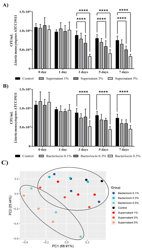 Considering these results, in the next step, we examined the effects of the bacteriocin-containing supernatant (Figure 7A) and partially purified bacteriocin (Figure 7B) on the abundance of L. monocytogenes ATCC19111 in the milk model over a seven-day storage period at 4 °C. After three days of storage with 3% (v/v) and 5% (v/v) bacteriocin-containing supernatants, decreases were observed in the number of L. monocytogenes ATCC19111 by 23.5% and 63.5%, respectively. These reductions remained unchanged until the 7th day, when reductions were observed in the number of L. monocytogenes ATCC19111 by 33.2% and 56.5%, respectively. In comparison with the control, only the highest concentration of partially purified bacteriocin reduced the number of L. monocytogenes ATCC19111 to 58.9% after three days of storage. Additionally, the same concentration was effective after the 7th day of application, and a 61% reduction was observed compared to the control. Finally, principal component analysis confirmed the strong separation of the milk samples only infected with L. monocytogenes ATCC19111 (control) from the infected milk samples treated with the highest concentration of partially purified bacteriocin (bacteriocin 0.5%) and bacteriocin-containing supernatant (supernatant 5%) of BGZLM1-5 (Figure 7C).