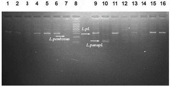 Multiplex PCR analysis of newly isolated LABs, with species-specific primers for L. plantarum, L. paraplantarum, and L. pentosus. The PCR products were visualized in 1.5% agarose gel (agarose sigma, type I) after ethidium bromide staining and the use of the transilluminator uVp system and camera Image Master VDS (Amersham Pharmacia Biotech, Italy). Lines: 1—L1; 2—L2; 3—L12; 4—L4; 5—L5; 6—L6; 7—L. pentosus ATCC 8041T; 8—Mol. -Gen Ladder 100 bp + 1.5 kbp (Gennaxon, Germany); 9—L. plantarum ATCC 14917T (PCR control); 10—L. paraplantarum ATCC 700211T (PCR control); 11—L7; 12—L8; 13—L9; 14—L10; 15—L11; 16—L13.