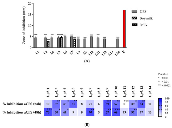 (A). In vitro inhibitory activity of L. plantarum’s CFS from exponential culture in MRS, fermented skimmed milk (10% w/v Humana, Germany), and fresh-made sterile soya milk against S. aureus V00037. Legend: for every analysis, the means and standard errors are calculated, and S.D. values are displayed as Y-error bars in the figures. Standard deviations (sample n = 3) are displayed as error bars. ANOVA test p < 0.05. A positive-control, E (Erythromycin), was used (15 µg/disk, NCZPD, BulBio). (B). In vitro inhibitory activity of L. plantarum’s postbiotics (aCFS) from exponential (24 h)- and stationary-phase (48 h) cultures in MRS broth against S. aureus V00037. The data from triplicates are subjected to statistical analyses and the differences for the samples and controls are assessed using the ANOVA test: * p < 0.05; ** p < 0.01, and *** p < 0.001.