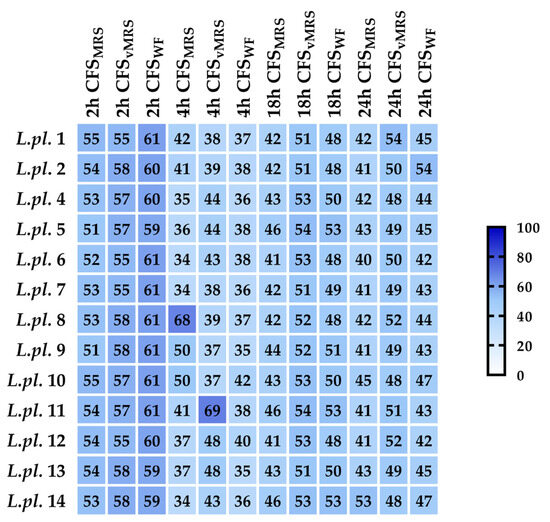 Heatmap diagram summarizing in vitro results of the inhibitory activity of Lactobacillus from “katak” on P. aeruginosa growth (calculated as % inhibition v/s control). The data from six replicates were subjected to statistical analyses and the differences for the samples (with postbiotics) and controls were assessed using the ANOVA test.All results show p < 0.001. Legend: horizontal: tested variants of postbiotics (CFSs) produced during the fermentation in different cultural media (MRS, vMRS, and WF from milk and time point in hours) of P. aeruginosa inhibition measurements. The sample codes on the right side consist of the abbreviation L.pl., derived from the name Lactiplantibacillus plantarum of the producers and strain numbers (L1 to L14).
