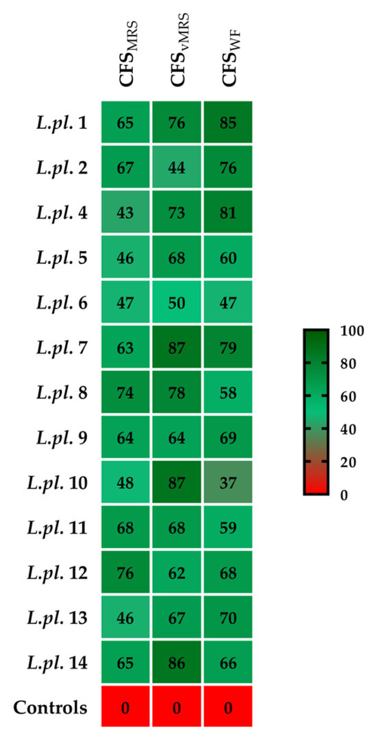 A heatmap diagram presenting the inhibition (as %) of P. aeruginosa biofilms formed in the presence of 10% (v/v) LAB postbiotics (CFSs from 24 h MRS broth, vMRS, and WF of fermented milks) tested. The data from six replicates were subjected to statistical analyses and the differences for the samples (with postbiotics) and controls were assessed using the ANOVA test: all results show p < 0.001. Legend: color code ranges from red (no inhibition as for the control) to green (higher % is dark green). The sample codes on the right side of the dendrogram consist of the abbreviation L.pl., derived from the name of the producers Lactiplantibacillus plantarum and strain number (L1, L2, etc.).