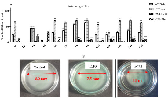 (A) In vitro test for the evaluation of flagellar activity (assessed for change in diameter during swimming motility in triplicate) of P. aeruginosa PAO1 in TSB with 0.3% agar (Oxoid, Hampshire, UK) in the presence of 1% (v/v) CFS and neutralized CFS (pH 6.0) of L. plantarum L1–L14 expressed as % inhibition relative to the control (no CFS added), and (B) illustration of the results from the in vitro test in the presence of postbiotics produced by L. plantarum strain L5 from “katak”. The data are presented as means ± SDs. * p < 0.05; ** p < 0.01, and *** p < 0.001.