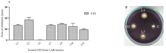 The in vitro experiments against Staphylococcus aureus V00037 proved that, within the species L. plantarum, there are strains with different spectra of inhibitory activity. Due to its metabolic activity, the results are the most pronounced for the CFS produced in the MRS broth. Lactobacilli showed approximately the same zones of inhibition in the initial test of lactobacilli cultures in the MRS medium by the agar diffusion method, except for L. plantarum L13 (Figure 3). However, when cultured in sterile, freshly prepared soya milk, only three strains showed activity (Figure 3A). It is evident that in all three versions of the test (with CFS, skimmed milk, and soya milk), the obtained zones of inhibition are much smaller than the positive-control-antibiotic Erythromycin (15 µg/disk, NCZPD, BulBio). Despite the considerable statistically significant difference (p < 0.05) between them, these results confirm the synthesis of postbiotics with promising activity.