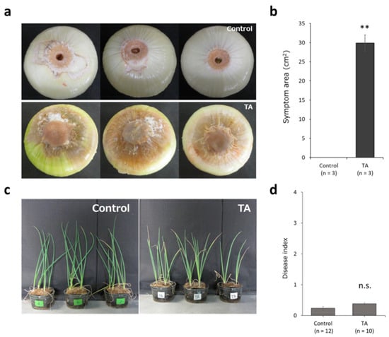 Results of the pathogenicity test of Foc_TA toward onion and shallot plants. (a) Symptoms of non-inoculated and Foc_TA-inoculated onions. (b) Symptom area on inoculated onion bulb. n represents sample size. Asterisks indicate a significant difference (** p < 0.01) compared to the control using a Student’s t-test. (c) Symptoms of non-inoculated and Foc_TA–inoculated shallots. (d) Average disease index of shallot plants inoculated with wild-type Foc_TA five weeks after inoculation. n represents the sample size. n.s. denotes “not significant” compared to control using a Student’s t-test. All data are presented as mean and standard error.