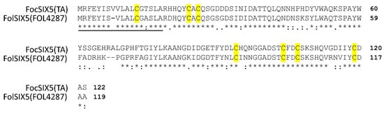 Alignment of the amino acid sequences of FocSIX5 and FolSIX5. The underline in the sequence alignment shows the signal peptides predicted using SignalP5.0. The yellow boxes indicate cysteine residues in the amino acid sequences. The asterisks (*) indicate identical amino acids.
