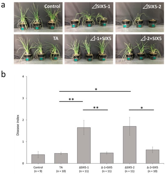 Results of the pathogenicity test toward shallot plants with FocSIX5 gene knockout and gene complementation mutant. (a) Photographs of representative shallot plants inoculated with wild-type Foc_TA, FocSIX5 gene knockout (ΔSIX5-1 and ΔSIX5-2), and FocSIX5 gene complementation mutants (ΔSIX5-1 + SIX5 [Δ-1 + SIX5] and ΔSIX5-2 + SIX5 [Δ-2 + SIX5]) five weeks after inoculation. (b) Average disease index of shallot plants inoculated with wild-type Foc_TA, FocSIX5 gene knockout (ΔSIX5-1 and ΔSIX5-2), and FocSIX5 gene complementation mutants (ΔSIX5-1 + SIX5 [Δ-1 + SIX5] and ΔSIX5-2 + SIX5 [Δ-2 + SIX5]) five weeks after inoculation. Results of at least two experiments were combined. Asterisks indicate a significant difference (** p < 0.01, * p < 0.05) evaluated using a Student’s t-test. n represents sample size. Data are presented as mean and standard error.