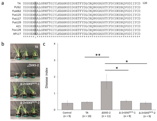 To evade plant immunity, pathogens mutate the nucleotide sequences of their avirulence effectors, resulting in nonsynonymous substitutions. Therefore, we used BLAST to investigate whether there were sequence variations in FocSIX5 among different isolates. Notably, a single-nucleotide polymorphism (G200A) was detected in the FocSIX5 nucleotide sequence of the Foc_A21 strain isolated from the United Kingdom [8] and the Fox129 strain isolated from Finland [5], leading to a nonsynonymous substitution (R67K) (Figure 4a). Additionally, the same nonsynonymous substitution (R67K) was found in the Australian AP117 strain as in our Foc collection (Accession No. LC731005). Thus, we speculate that this nonsynonymous substitution may be a strategy used by Foc to avoid recognition by the host. To test this hypothesis, we generated a gene complementation mutant with the FocSIX5 gene construct, including the G200A SNP (ΔSIX5-2 + SIX5R67K-1 [Δ-2 + SIX5R67K-1] and ΔSIX5-2 + SIX5R67K-2 [Δ-2 + SIX5R67K-2]) (Figure S5), and performed pathogenicity tests on shallots. Contrary to our hypothesis, shallot plants inoculated with mutants expressing SIX5 protein variants carrying the R67K substitution exhibited a highly resistant phenotype, suggesting that host plant immunity was not related to a single amino acid mutation (R67K) in FocSIX5 (Figure 4b,c).