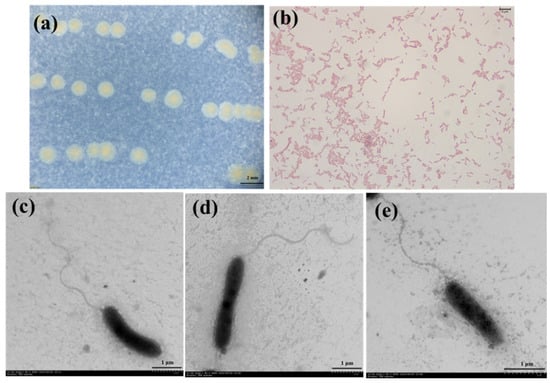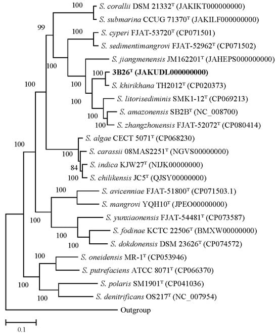 Visible colonies of strain 3B26T were light-yellow-colored on MA for 48 h when incubated at 30 °C, and its cells were observed to be straight or curved in a rod shape and motile by means of a single polar flagellum (Figure 1). As shown in Table 1, the colony colors of strain 3B26T and its relatives were significantly different and thus could be used as a simple indicator to distinguish them [8,9,10,11,12]. The cell growth of strain 3B26T was found to occur at 10–40 °C (optimum, 28 °C) and at pH 4.0–9.0 (optimum, 7). The cells could tolerate up to 5% NaCl (w/v), as growth was not observed at 6% NaCl. The cells could grow on MA, R2A, LB, TSA, and NA media. Strain 3B26T was positive for oxidase and catalase and could hydrolyze skim milk. Strain 3B26T and the reference type strains could reduce nitrate to nitrite, except for S. zhangzhouensis FJAT-52072T [12]. The cells were found to be Gram-stain-negative (Figure 1) and positive for catalase; oxidase; the hydrolysis of Tweens 20, 40, 60, and 80; skim milk; gelatin; and aesculin but negative for the hydrolysis of starch, casein, and carboxymethyl cellulose. Unlike strain 3B26T, type strain S. Khirikhana TH2012T could hydrolyze casein [11]. The cells were found to assimilate D-glucose, D-maltose, N-acetyl-glucosamine, D-mannose, and malic acid as carbon sources. API 20NE tests indicated that the profiles of the substrate utilization of strain 3B26T and its relatives were different, especially in D-glucose, D-mannose, and potassium gluconate (Table 1). The physiological characteristics of strain 3B26T were similar to those of related reference type strains (Table 1). Nevertheless, some distinct characteristics of strain 3B26T in Table 1 can be distinguished from its related type strains.