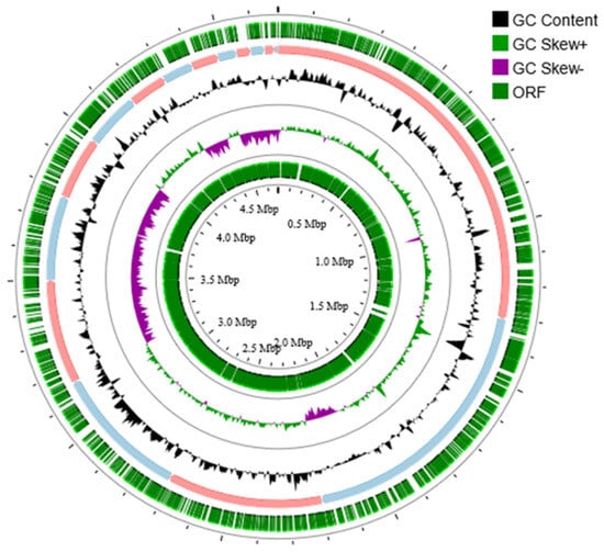 The completeness and contamination of the final assembled genome of strain 3B26T were 100% and 0.62% based on the estimation performed by CheckM (Supplementary Table S1). The complete 16S rRNA gene sequence of strain 3B26T was extracted from its assembled genome and shares 100% of its identity with that obtained via PCR, confirming the authenticity of the genome assembly. Therefore, the genome of strain 3B26T can be considered high quality. The genome of strain 3B26T consists of 18 contigs with a genome size of 4,682,650 bp and genome DNA G + C content of 54.8% (Figure 2). Similar to strain 3B26T, the genomes of the reference type strains were of high quality given the ≤1% contamination and 100% completeness [23] determined by the CheckM. The genomic size of strain 3B26T was smaller than that of S. khirikhana TH2012T and greater than those of the other type strains. The genomic DNA G + C content of strain 3B26T (54.8%) was higher than those of S. amazonensis SB2BT (53.6%), S. zhangzhouensis FJAT-52072T (53.7%), and S. litorisediminis SMK1-12T (54.0%) and slightly lower than those of S. khirikhana TH2012T (54.9%) and S. jiangmenensis JM162201T (55.0%). In the genome sequence of strain 3B26T, 4083 CDSs, 3 rRNA genes (a gene copy of 5S rRNA-16S rRNA-23S rRNA), and 64 tRNA genes were annotated (Supplementary Table S1).