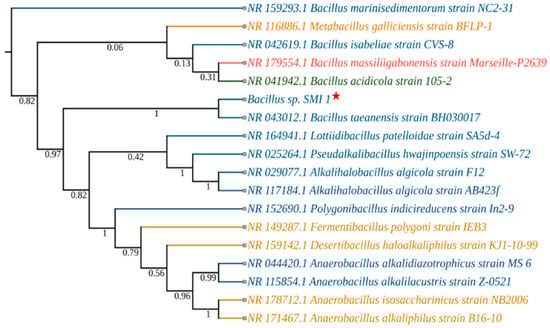 The phylogenetic tree of SMI_1 was constructed with the neighbor-joining method to analyze the evolutionary relationship of Bacillus taeanensis SMI_1. It showed 98% similarity with Bacillus taeanensis BH030017 based on NCBI (BLASTn) 16S rRNA sequences (the colors reflect the source of isolation: blue—marine; green—plant; red—human; yellow—soil and other). Red Star indicates the isolated marine bacterial isolate and its phylogenetic position.