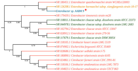 The neighbor-joining method was used to develop the phylogenetic tree to analyze the evolutionary relationship of Enterobacter sp. AABM_9, which showed 97.47% similarity with Enterobacter hormaechei based on NCBI (BLASTn) 16S rRNA sequences (the colors reflect the source of isolation: blue—marine; green—plant; red—human; yellow—soil and other). Red Star indicates the isolated marine bacterial isolate and its phylogenetic position.