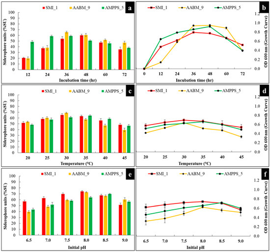 Effect of physicochemical parameters of (a,b) incubation time, (c,d) temperature, and (e,f) initial pH on siderophore production and growth of marine bacterial isolates (SMI_1, AABM_9, and AMPPS_5).