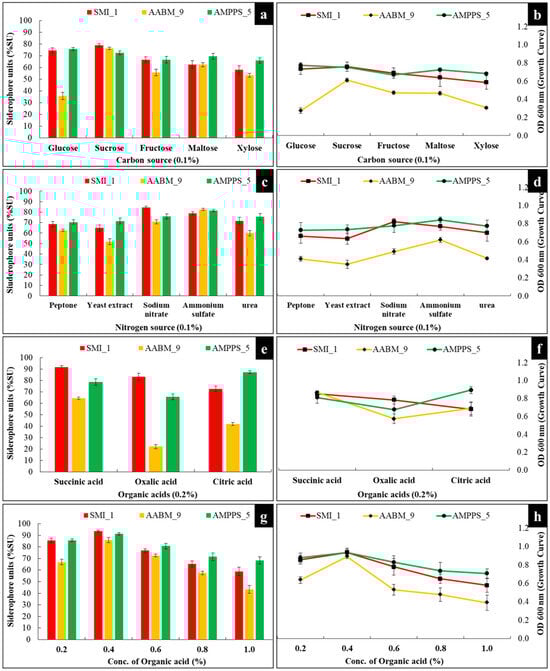 Effect of (a,b) carbon source, (c,d) nitrogen source, (e,f) organic acids, and (g,h) concentration of organic acid on siderophore production and growth of marine bacterial isolates (SMI_1, AABM_9, and AMPPS_5).