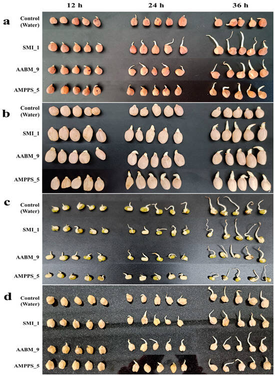 Seed germination ((a) Brown chickpea, (b) Peanut, (c) Green gram, and (d) Kabuli chana) in the presence of tap water (control) and cell-free supernatant of marine bacterial isolates (SMI_1, AABM_9, and AMPPS_5).
