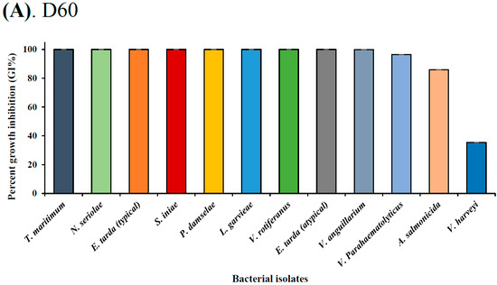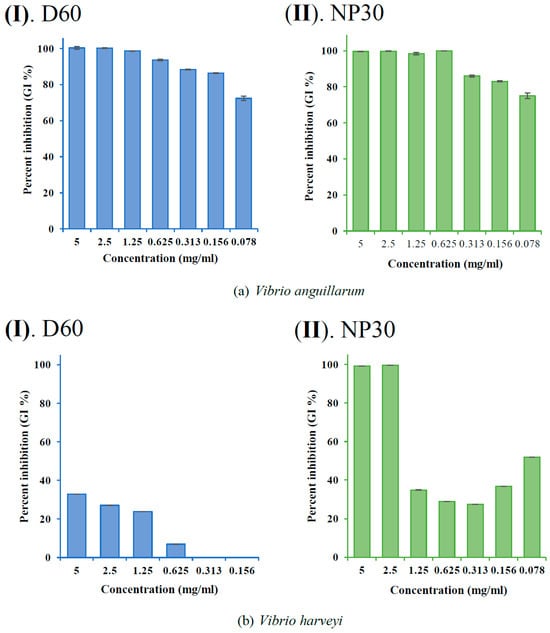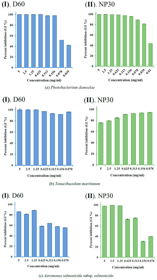 Percent growth inhibition (GI %) of Vibrio spp. at all growth inhibiting concentrations: (a) GI % of Vibrio anguillarum for D60 (I) and NP30 (II); (b) GI % of Vibrio harveyi for D60 (I) and NP30 (II); (c) GI % of Vibrio parahaemolyticus for D60 (I) and NP30 (II); (d) GI % of Vibrio rotiferanus for D60 (I) and NP30 (II). All data are expressed as means ± SEM (n = 3).