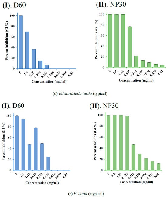 Percent growth inhibition (GI %) of some Gram-negative bacteria strains at all growth-inhibiting concentrations observed: (a) GI % of Photobacterium damselae subsp. piscicida; (b) GI % of Tericibaculum maritimum; (c) GI % of Aeromonas. salmonicida subsp. salmonicida; (d) GI % of Edwardsiella tarda (typical); (e) GI % of Edwardsiella tarda (atypical) for D60 (I) and NP30 (II). All data are expressed as means ± SEM (n = 3).