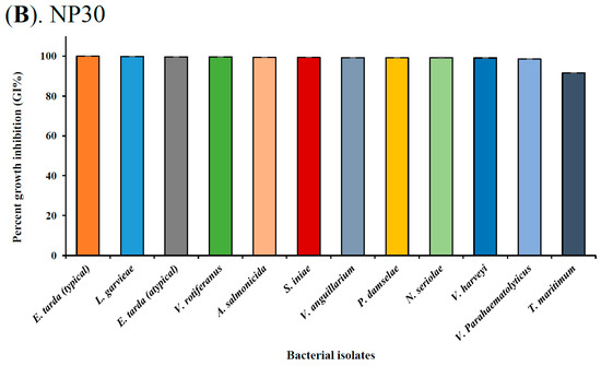 We observed increasing GI % with decreasing concentration for NP30 against T. maritimum (Figure 5c), which we initially thought to be the display of the Eagle effect [39]. Divya et al. [80] reported similar results, where lower, rather than higher, concentrations of some of their chitosan nanoparticles showed higher growth inhibition. However, bactericidal properties were observed at higher NP30 concentrations (5 mg) and lower concentrations (until 0.313 mg). T. maritimum is a filamentous bacterium with rhizoids with which gliding colonies adhere to one another, creating a massive network of bacteria mass [58]. On the other hand, the iBCA-NPs assay transparency increased (decreasing OD620 value) by dilution. The effect of bacteria lysis and assay transparency on OD readings was suspected to have accounted for the inconsistency observed.