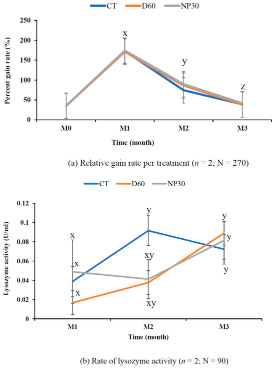 Macroscopic physical examinations of fish during each sampling time suggested healthy growth in all treatments. Lysozyme activity increased with the age of rainbow trout. The control group had the highest lysozyme activity (0.092 ± 0.031 U/mL) at the end of the eighth week but declined steadily to be the lowest (0.072 ± 0.01 U/mL) at the end of this study. On the other hand, lysozyme activity of the D60 group was the lowest (0.017 ± 001 U/mL) at the end of the fourth week but steadily increased to become the highest (0.089 ± 0.025 U/mL) at the end of the 12th week (Figure 7b). Lysozyme activity after the first four weeks was significantly lower (p < 0.05) than the activity rate after the twelfth week (Figure 7b). However, there was no significant difference among the treatments at any sampling time (p > 0.05).