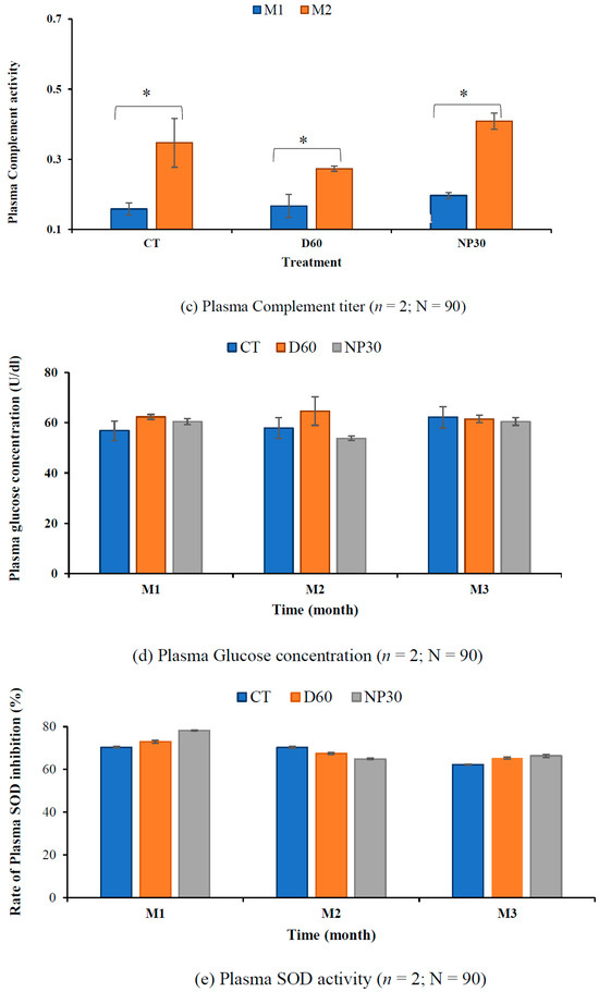 Lysozyme activity in blood plasma was examined via the turbidimetric assay and lysis of the lysozyme-sensitive Gram-positive bacterium Micrococcus lysodeikticus (Sigma), according to [43]. For complement titer, sample plasma and 25 µL of sheep red blood cells (Japan Lamb) were suspended and allowed to react for 1 h at room temperature. After completion of the reaction, 50 µL of EGTA, Mg2+, and GGVB (glucose gelatin veronal buffer with 10 mM glycol ether diamine tetra acetic acid and 40 mM MgCl2) were added, and the mixture was centrifuged at 4 °C for 3000× g for 3 min. Then, 70 µL of the supernatant was added to a 96-well plate, and the absorbance value at 493 nm wavelength was measured with a microplate reader (Thermo Scientific Multiskan FC, Shanghai, China). The complement titer, y, was computed using the following formula: