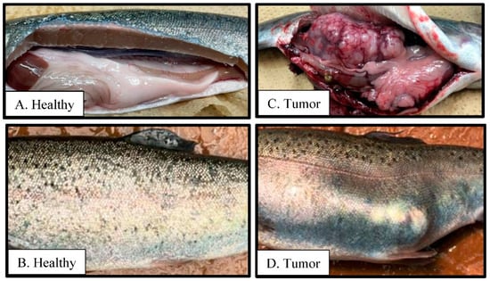 Plate comparing healthy rainbow trout (A,B) and one with a tumor (C,D) isolated from an NP30 (N = 1; where N = total number of fish).