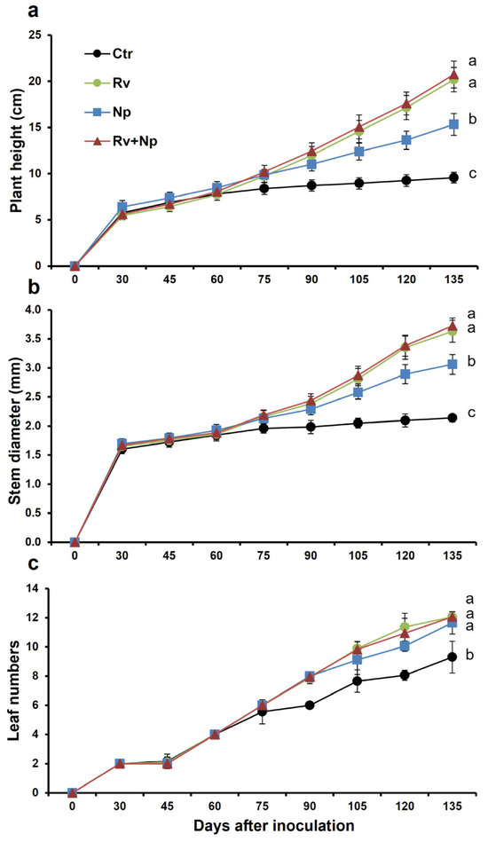 Effect of single and dual arbuscular mycorrhizal fungal inoculation on (a) plant height (cm), (b) number of coffee leaves per plant and (c) stem diameter (cm) in coffee plants along 135 days of vegetative growth measured (15-day intervals). Mean values per treatment. Error bars indicate standard deviation (±S.D.). Different letters indicate significantly different means (p < 0.05). Ctr = Non-inoculated, Rv = Inoculation with Rhizoglomus variabile, Np = Inoculation with Nanoglomus plukenetiae.
