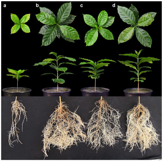 Illustration of coffee leaf, shoot and root growth 135 days in (a) non-mycorrhizal control plants, after single inoculation with (b) Rhizoglomus variabile, or (c) Nanoglomus plukenetiae, and (d) after dual inoculation with both AMF species.