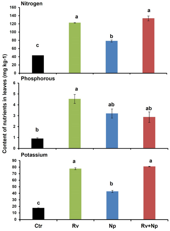 Nitrogen, phosphorus and potassium contents (mg kg−1) of coffee leaves after 135 days in non-mycorrhizal control plants (Ctr), after single inoculation with Rhizoglomus variabile (Rv), or Nanoglomus plukenetiae (Np), and after dual inoculation with both AMF species (Rv+Np). Mean values per treatment. Error bars indicate standard deviation (±S.D.). Columns sharing the same letter were not significantly different (p < 0.05). Ctr = Non-inoculated, Rv = Inoculation with Rhizoglomus variabile, Np = Inoculation with Nanoglomus plukenetiae.