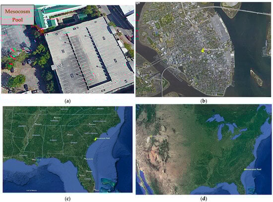 (a) Aerial view of the Saint Philip’s Street Parking Garage in Charleston, SC. The mesocosm pool is in the northwest corner; (b) Location of the mesocosm pool on the Charleston, SC peninsula showing distance from the Ashley and Cooper Rivers; (c) Regional scale location of the mesocosm pool in the Southeastern United States; (d) Location of the mesocosm pool and the Great Salt Lake on the North American continent.