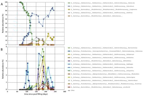 Relative abundance over time of archaeal and bacterial taxa in the mesocosm pool. (A) Taxa that achieved relatively large populations (>10%) at any point during the experiment. (B) Halophilic bacterial and archaeal taxa that displayed measurable but smaller populations during the experiment.