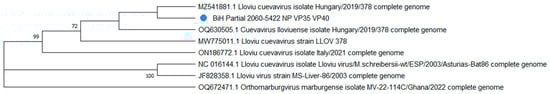 Phylogenetic tree of the BiH partial sequence of NP VP35 and VP40 genes (marked with a blue dot). The bootstrap consensus tree was constructed in MEGAX using the Maximum Likelihood method (Hasegawa–Kishino–Yano substitution model, 1000 bootstrap replicates). The Orthomarburgvirus sequence was used as an outgroup.