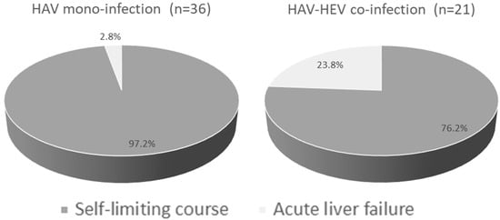 3.3. Outcomes of HAV Mono-Infection and HAV–HEV Co-Infections and Characteristics of ALF Cases in Both Groups
