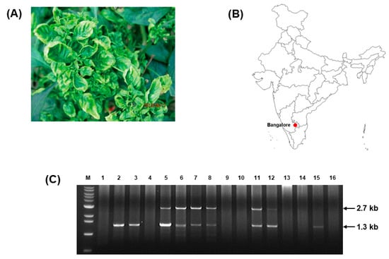 ToLCJoV detection from pepper (C. annuum) in India. (A) Symptomatic pepper plants collected from Bangalore, Karnataka, India. (B) Location of sample collection on map. (C) Gel electrophoresis of RCA product digestion with BamHI showed an association of the geminivirus with the expected satellite molecules. Lane M: 100 bp ladder, line 1–16: RCA products of 16 samples after digested by enzyme.