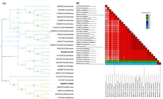 Phylogenetic and SDT analysis of ToLCJoB and ToLCBDB. “*”: the betasatellite isolates used in this study and others available in GenBank were used to generate the phylogenetic tree using the Tamura-Nei model and neighbor-joining method along with 1000 bootstraps: (A) relation between ToLCJoB and ToLCBDB through the phylogenetic tree, (B) relation of the IR between all viruses that have no association in this study using the SDT.