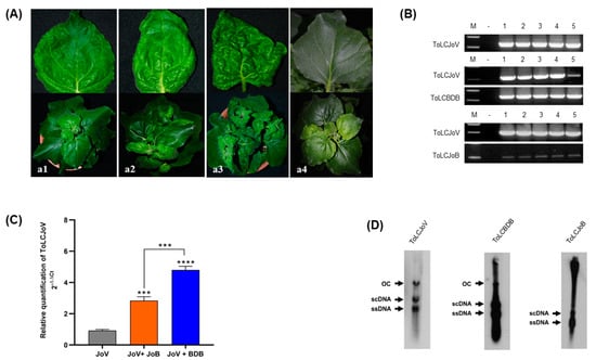 To perform a comparison of symptom development and transreplication preferences, three combinations of inoculation were prepared: ToLCJoV only, ToLCJoV × ToLCJoB, and ToLCJoV × ToLCBDB. Each combination was inoculated into five plants of N. benthamiana.