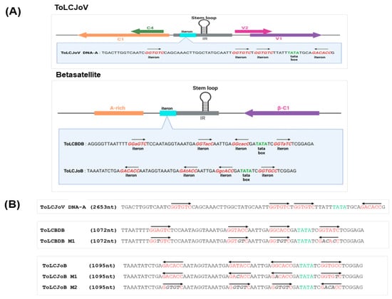 Iteron analysis and mutant virus design. (A) Iteron resemblance analysis of ToLCJoV, ToLCBDB, and ToLCJoB. (B) Iteron modification for mutant betasatellites of ToLCBDB and ToLCJoB. Iteron modification sequence is shown in italic gray letters, and the arrow explains the sequence direction.