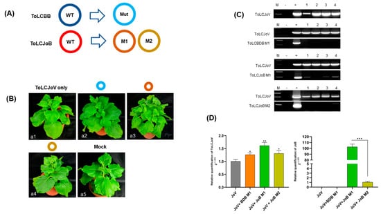 Infectivity assay of ToLCBB and ToLCJoB mutant clones in N.benthamiana (A) Illustration of mutant genome of each satellite (B) Phenotype of mutant betasatelliteagroinoculation combination: (a1) ToLCJoV only, (a2) ToLCJoV × ToLCBDB M1, (a3) ToLCJoV × ToLCJoB M1, (a4) ToLCJoV × ToLCJoB M2, (a5) Mock plant. (C) PCR result of 28-days post inoculation of mutant betasatelliteagroinoculation combination. Lane M: 100 bp marker, lane −: negative control, lane +: positive control, lane 1–4: inoculated plants (D) qPCR results to quantify relative fold change of viral DNAfoToLCJoV and ToLCJoB in mutant-clone-inoculated plants.The statistical comparison was performed using the unpaired t-test: * p < 0.1, ** p < 0.01, *** p < 0.001.
