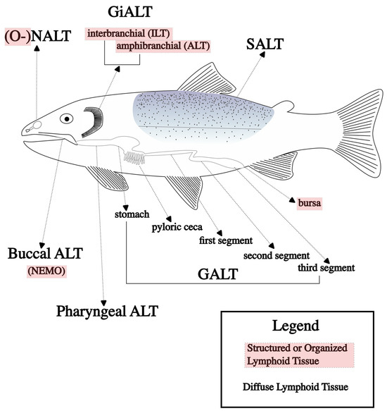 Diffuse networks of leukocytes in mucosal barriers are more commonly described in the teleost vaccine literature; these are generally called mucosa-associated lymphoid tissues (MALTs). These tissues have been described in several mucosal sites of fish, including skin (SALT), gill (GiALT), gut (GALT), nasal (NALT), buccal, and pharyngeal sites, but are likely present in all fish mucosal barriers [61,62]; the main MALTs are shown in Figure 1, along with the organized lymphoid structures described previously. Characteristic of mucosal barriers, these lymphoid tissues are colonized with a diverse arrangement of commensal microbes, and immune responses must be carefully regulated to provide defense while avoiding over-stimulation [53].