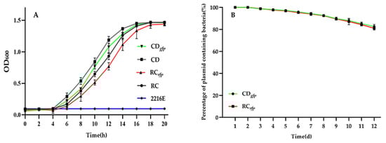 Evaluation of the biological functions of the fluorescent bacteria: (A) Growth curve of the wild-type strain and fluorescent strain at 28 °C in 2216E medium; (B) Plasmid retention in bacterial strains over time in 2216E medium. Data are the means of three independent experiments and are presented as the means ± SD.