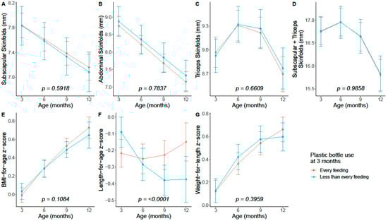 We assessed the association of plastic bottle frequency at 3 months (<1 time/day, 1–3 times/day, 4+ times/day but not every feeding, and at every feeding) with anthropometric outcomes (subscapular skinfolds, triceps skinfolds, abdominal skinfolds, subscapular + triceps skinfolds, length-for-age z-score, BMI-for-age z-score, and weight-for-length z-score) at 12 months of age (n = 358–360). We then examined the association of 3-month plastic bottle frequency (<every feeding vs. every feeding) with growth trajectories of the above anthropometric outcomes at 3, 6, 9, and 12 months using linear mixed models (n = 442). All linear mixed models were assessed using Model 3. We additionally included a random intercept and a time-by-plastic bottle use interaction. We first fit models using maximum likelihood and determined the appropriateness of a linear or quadratic fit using a likelihood ratio test p < 0.05. We re-analyzed the best-fit model using restricted maximum likelihood to estimate fixed effects to generate trajectory plots; we present interaction terms based on linear fit models.